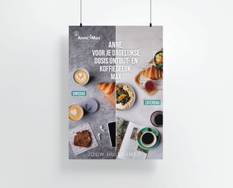 Bij Anne&Max kun je in de vroege ochtend terecht voor een snelle koffie to go. Op dagen dat je meer tijd hebt, kun je genieten van een uitgebreid ontbijt. Deze contrasten wilde ik weergeven in een tweedeling voor deze campagne: de dinsdagochtend met een cappuccino to go en een croissant of bananenbrood, en de zaterdagochtend met een uitgebreid ontbijt en slow koffie. Door eenheid te creëren zijn de producten verbonden, maar het geheel klopt door de lijn en de verschillende achtergronden.